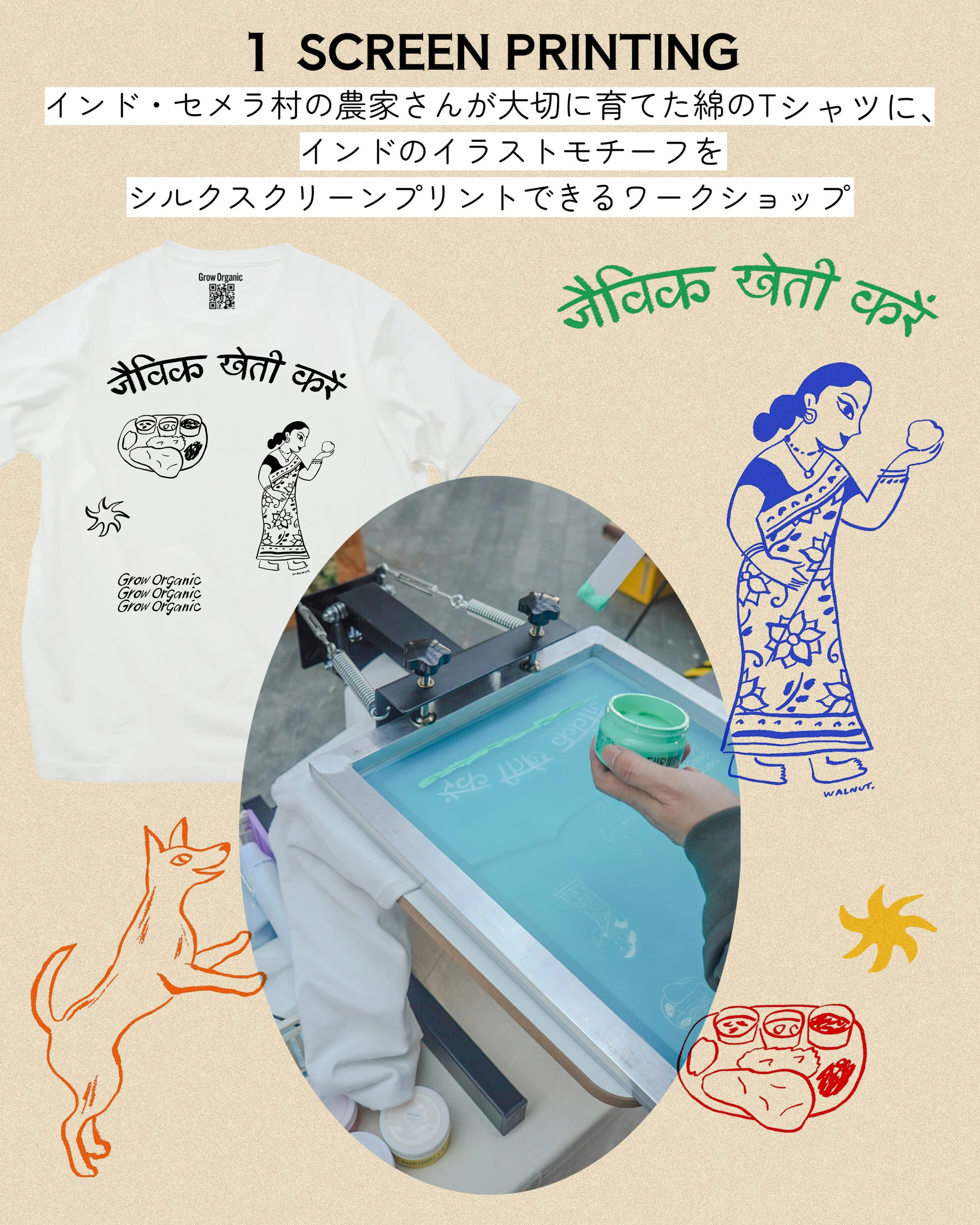 今回のために描き下ろしたインドモチーフのイラストを、コットン農家さんが育てた綿から作られたプレオーガニックコットンTシャツに、 お好きな色で好きなモチーフをシルクで刷っていただけます。